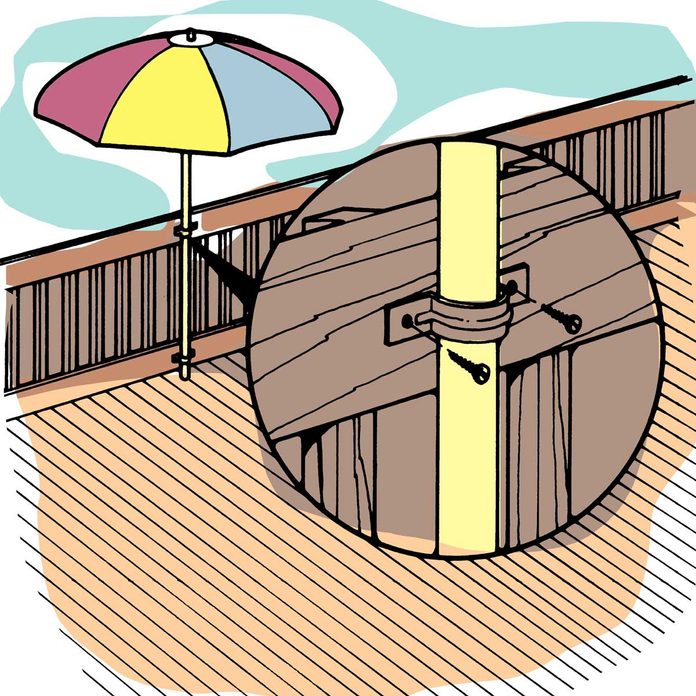 Does your deck umbrella always seem to be in the wrong spot to shade you from the sun? Mount several sets of galvanized plumbing pipe straps on the deck posts or railing in key places. Use straps with a slightly wider diameter than the umbrella pole. Then just pick a spot and slip the umbrella pole through the straps until the bottom of the pole rests on the deck. You’ll get shade right where you need it.