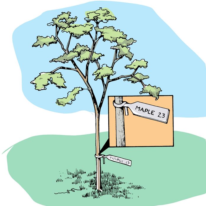 Keep those young trees in your yard from being damaged and possibly killed by the lawn mower or string trimmer. Cut the top and bottom off a clear 2-liter soda bottle, then slice this cylinder down the middle. It will curl around the tree, stay in place, and be almost invisible. — Louise S. McMillian