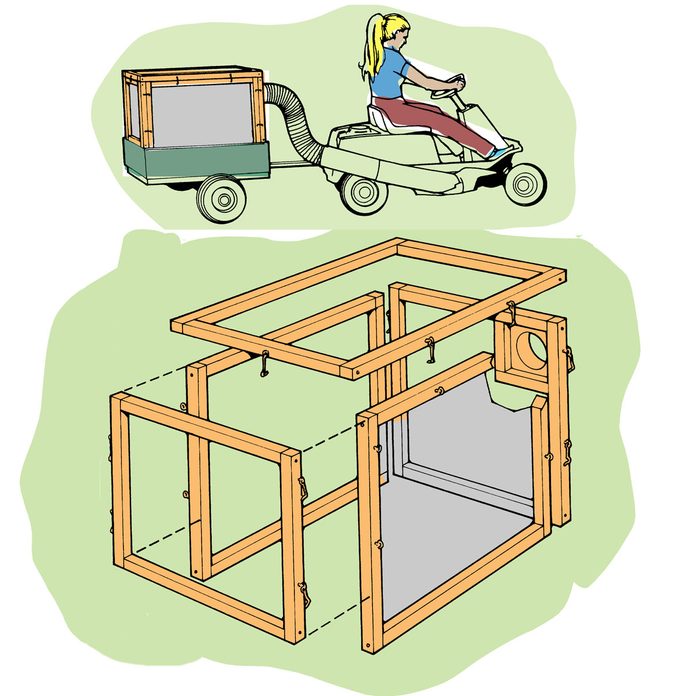 Tired of emptying the small grass catcher of your riding mower every five minutes? Build this large catcher that mounts in a lightweight garden trailer. The five panels are screwed-together 2x2s with ordinary window screen stapled to the insides. The panels are assembled with hooks and eyes, so the whole thing can come apart and hang on the garage wall. The back panel unhooks for emptying clippings onto the compost pile. The chute is made from flexible clothes dryer duct and fittings. Experiment with the ductwork first to see how high your mower will blow the grass, and then determine how high to build the catcher.