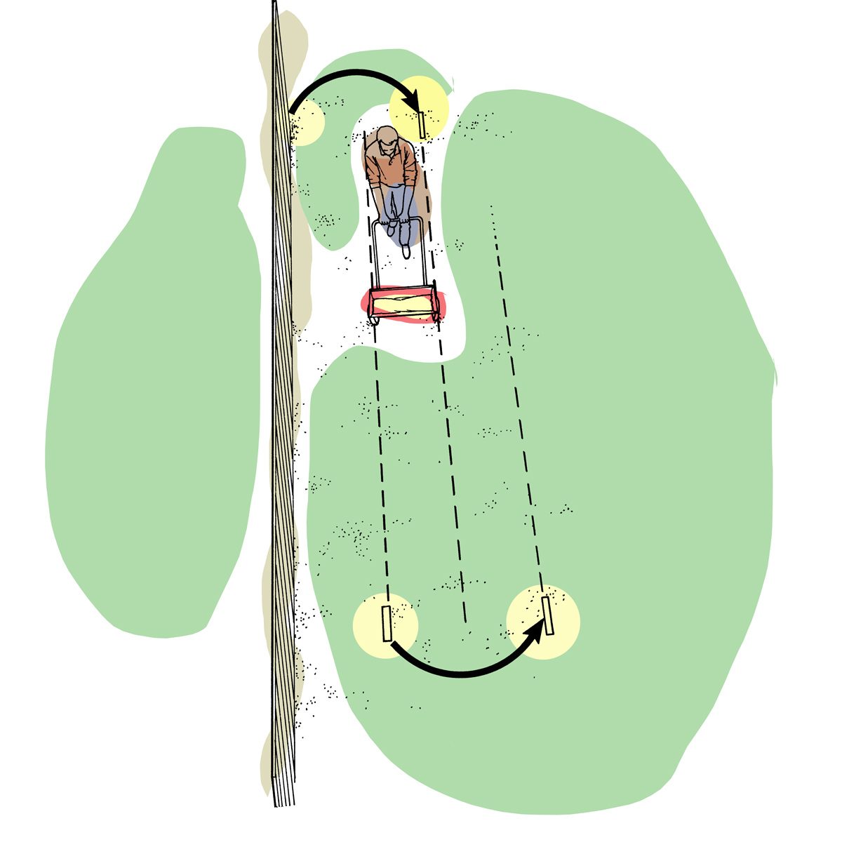 So you fertilized your lawn last week, and now you’ve got some streaks of pale grass where you missed, and some really dark streaks where you hit twice. To prevent this, use two short lengths of wood as markers. Whenever you start a new row from either end of your run, drop a marker at the edge of the line of the fertilizer. Aim for the marker as you proceed, and move the marker at each end every time you make a turn. It works with a broadcast spreader as well. — Jim Carabetta
