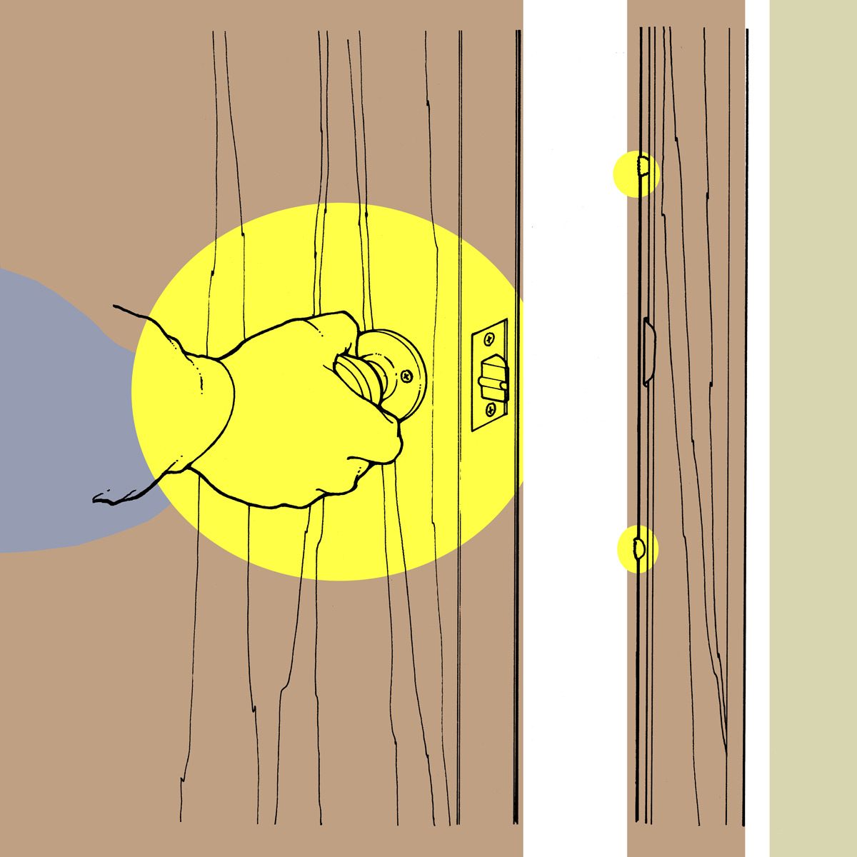 If you have a sizable hole in a painted hollow-core door, here’s a quick way to fix it: Completely fill the hole with spray foam insulation, so the foam is about level with the door surface. Allow it to dry overnight. The foam will expand slightly as it dries, forming a slight mound. Slice off the mound with a razor knife so the foam is slightly lower than the door surface. Apply one or two coats of drywall compound, sand it smooth when dry, and paint. — Richard Loeb Jr.
