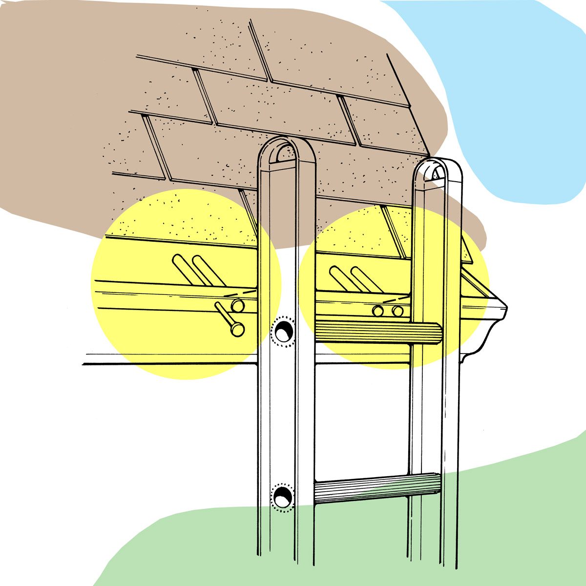 Do you manage to cave in your gutters every time you lean a ladder against them? Try this: In the area or areas where you’ll place your ladder, drill two 3/16-inch holes, and drive two 7-inch galvanized spikes with 5-inch ferrules into the gutters behind where each leg will rest. The ferrules will support the ladder’s weight instead of the gutter. Most home centers sell standard gutter spikes and ferrules. — Randy Lucas