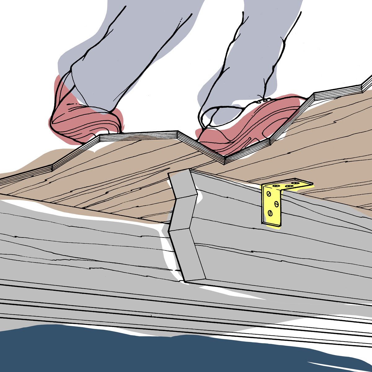 Squeaky floor driving you nuts? If the underside is exposed in the basement, it’s easy to fix. Have someone walk all over the floor while you stand in the basement. When you hear a squeak, mark that joist with chalk. Screw 3-inch L-brackets to the joists so their tops are flush with the tops of the joists. Then drive screws up into both the subfloor and the surface floor, pulling them down tight to the joists. — H.C. DeWaard