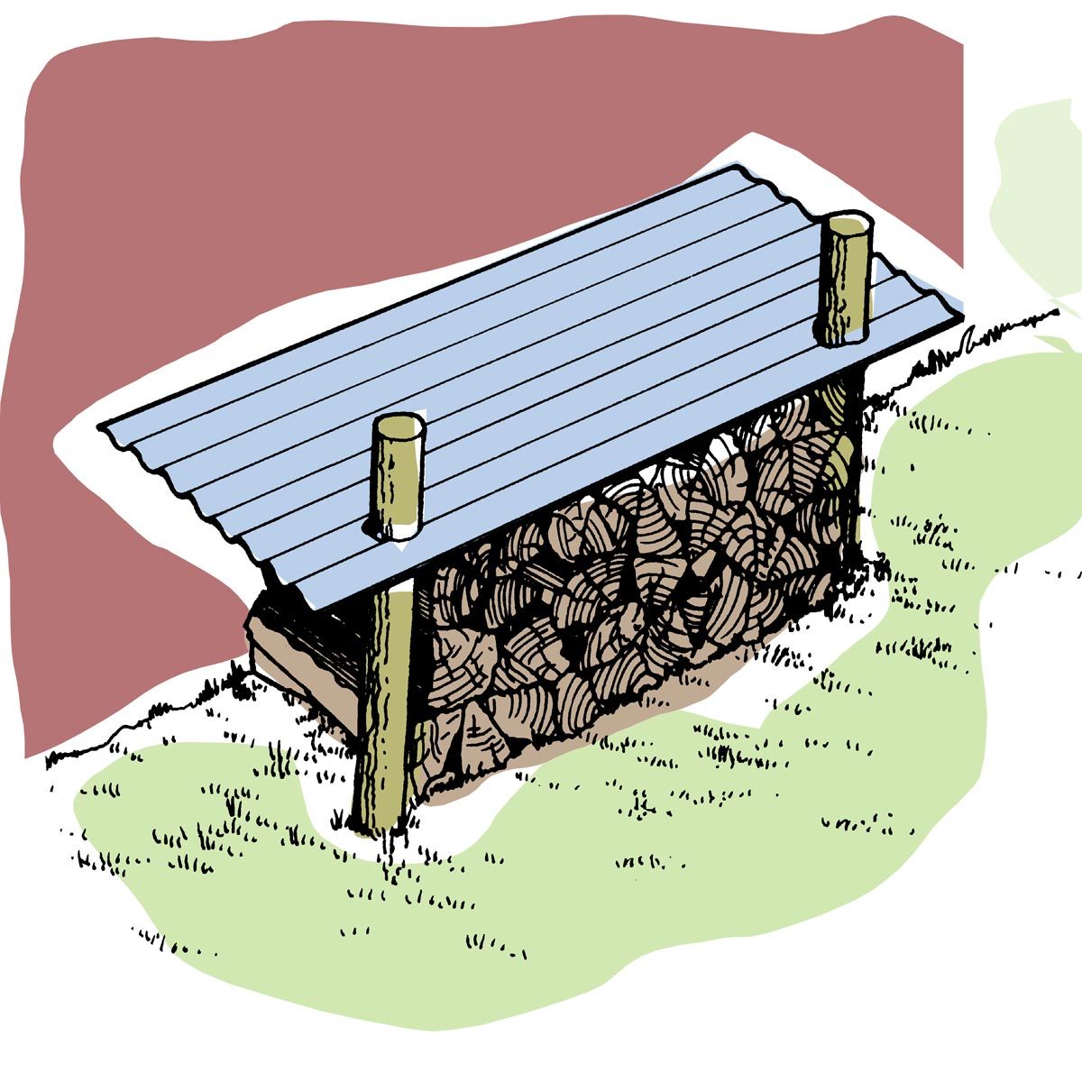 Here’s a low-tech, no-hassle shelter for keeping your firewood dry. Drive two stakes or poles into the ground 6-feet apart, and about 16-inches out from the wall. Stack the firewood between the poles. Cut two holes in a sheet of 2-x 8-foot corrugated fiberglass so it will slide down the poles and rest on top of the firewood. If you keep the pile somewhat level as you use the wood, the fiberglass will keep sliding down the poles to provide a snug covering for the wood. —Jack Curran