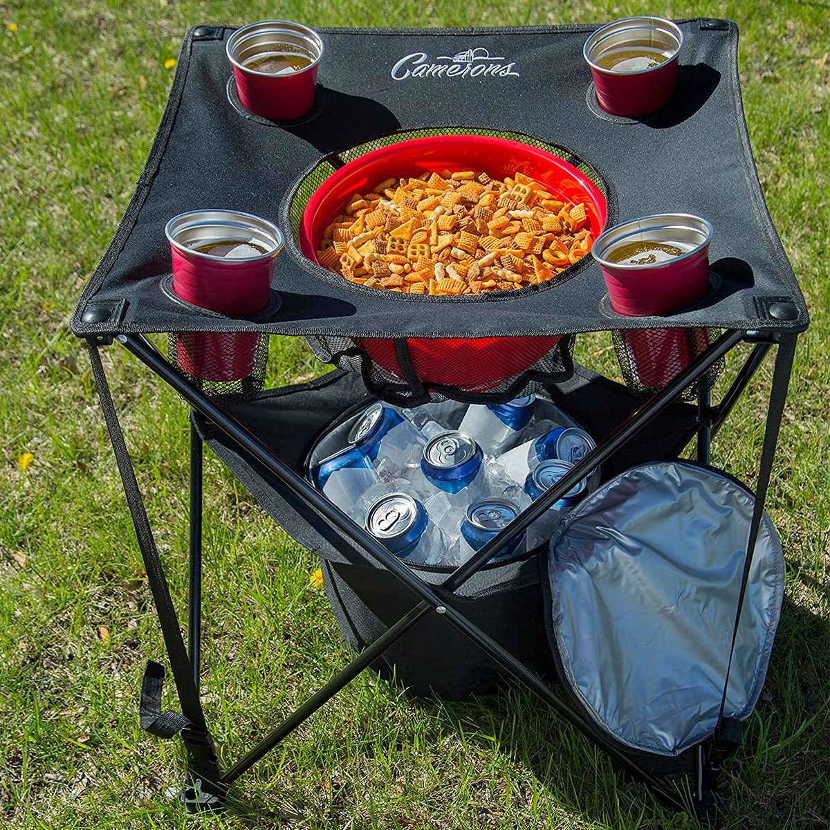 Keep drinks cold and snacks handy in one space-saving, portable design with this all-in-one tailgate table.
