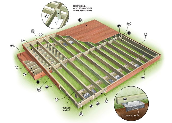 And if you don’t attach the deck to the house, you don’t need deep frost footings. That can save hours of backbreaking labor, especially in wooded or rocky areas where footings are difficult to dig. All you need are simple ground-level deck footings.
