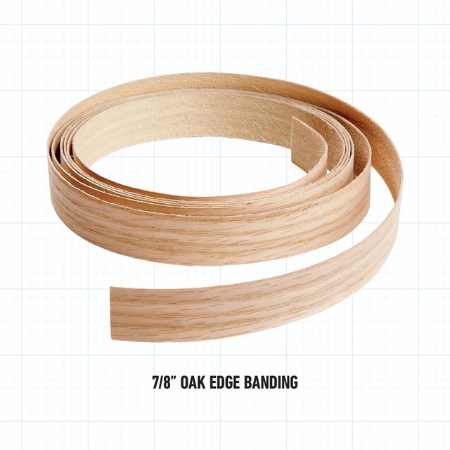 You’ll find edge banding in common species like birch, oak and cherry at home centers and lumberyards. For exotic species and a greater variety of widths, search online or visit a specialty woodworking store like Rockler or Woodcraft. Rolls of edge banding come in lengths of 8 feet to 250 feet and widths of 13/16 inch to 2 inch. For a typical 3/4-in. plywood, buy 13/16- or 7/8-in.-wide edge banding.