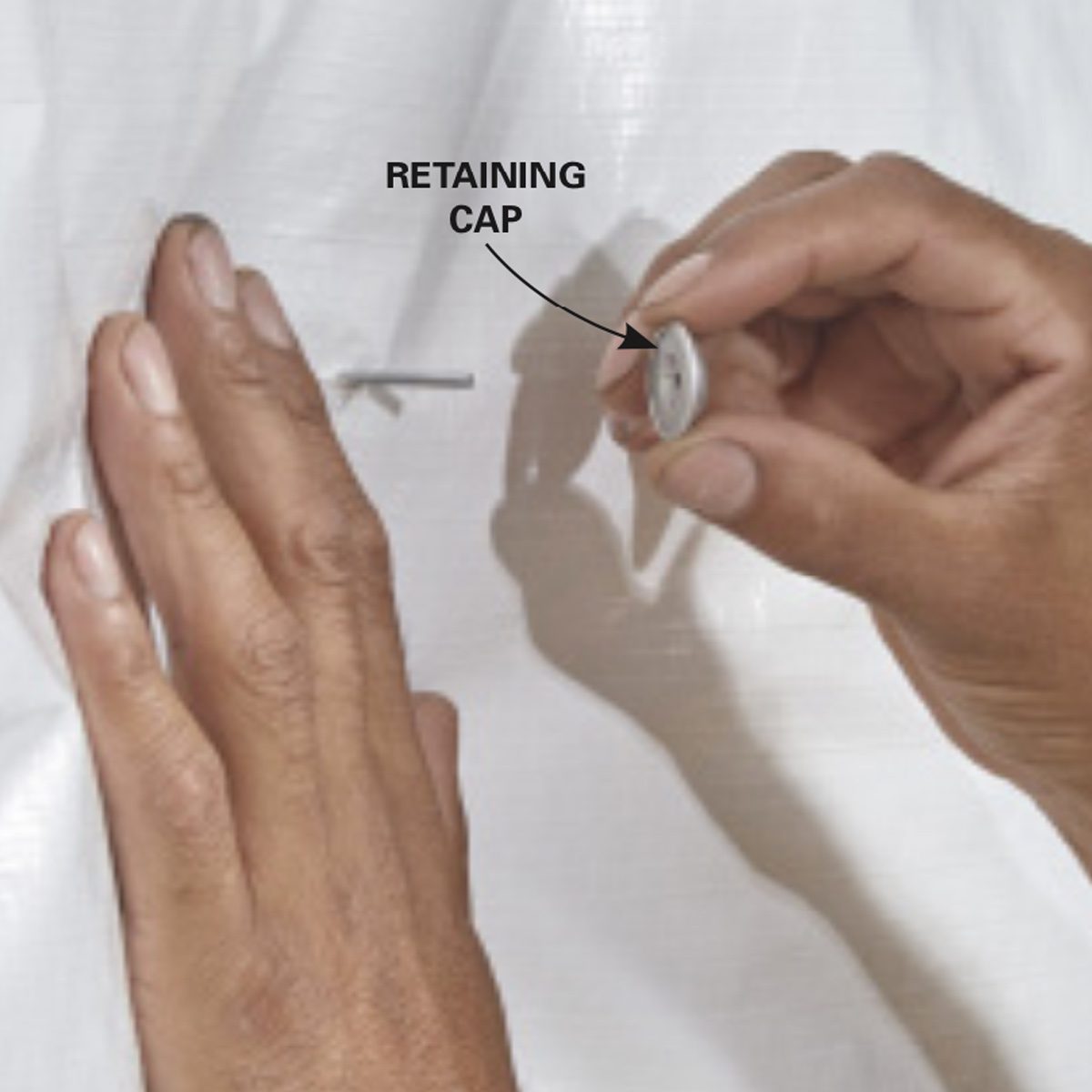 - Line up the insulation so it’s centered in the panel and push it against the retaining pin until it punctures the vinyl facing. Then push the retaining cap over the pin until it snaps into place.