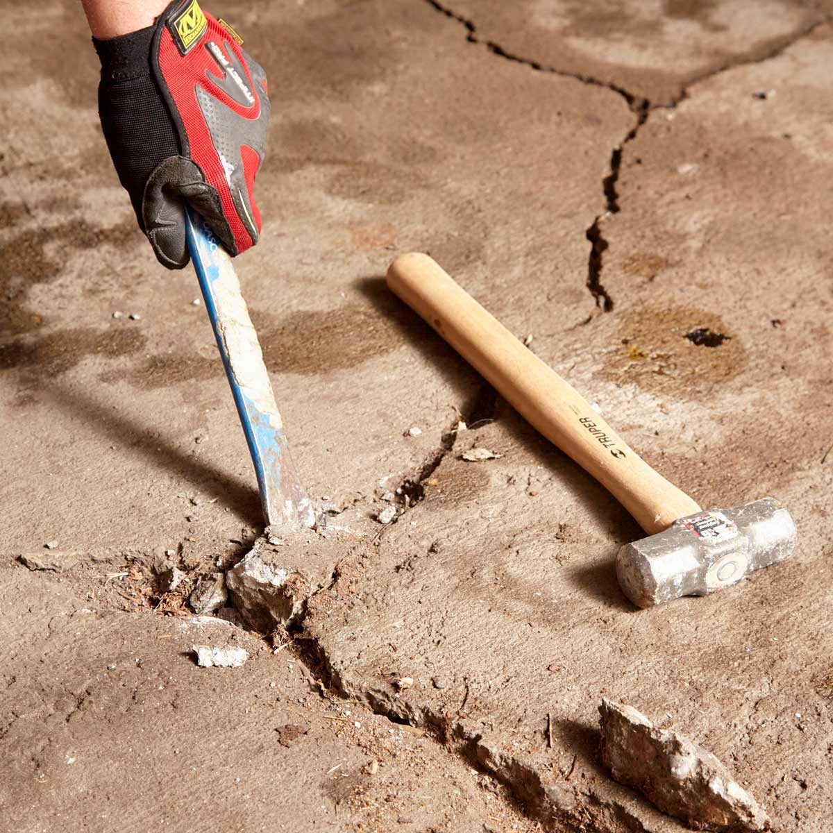 Chisel away any loose fragments along cracks or craters; there’s no need to bust away concrete that’s firmly attached.