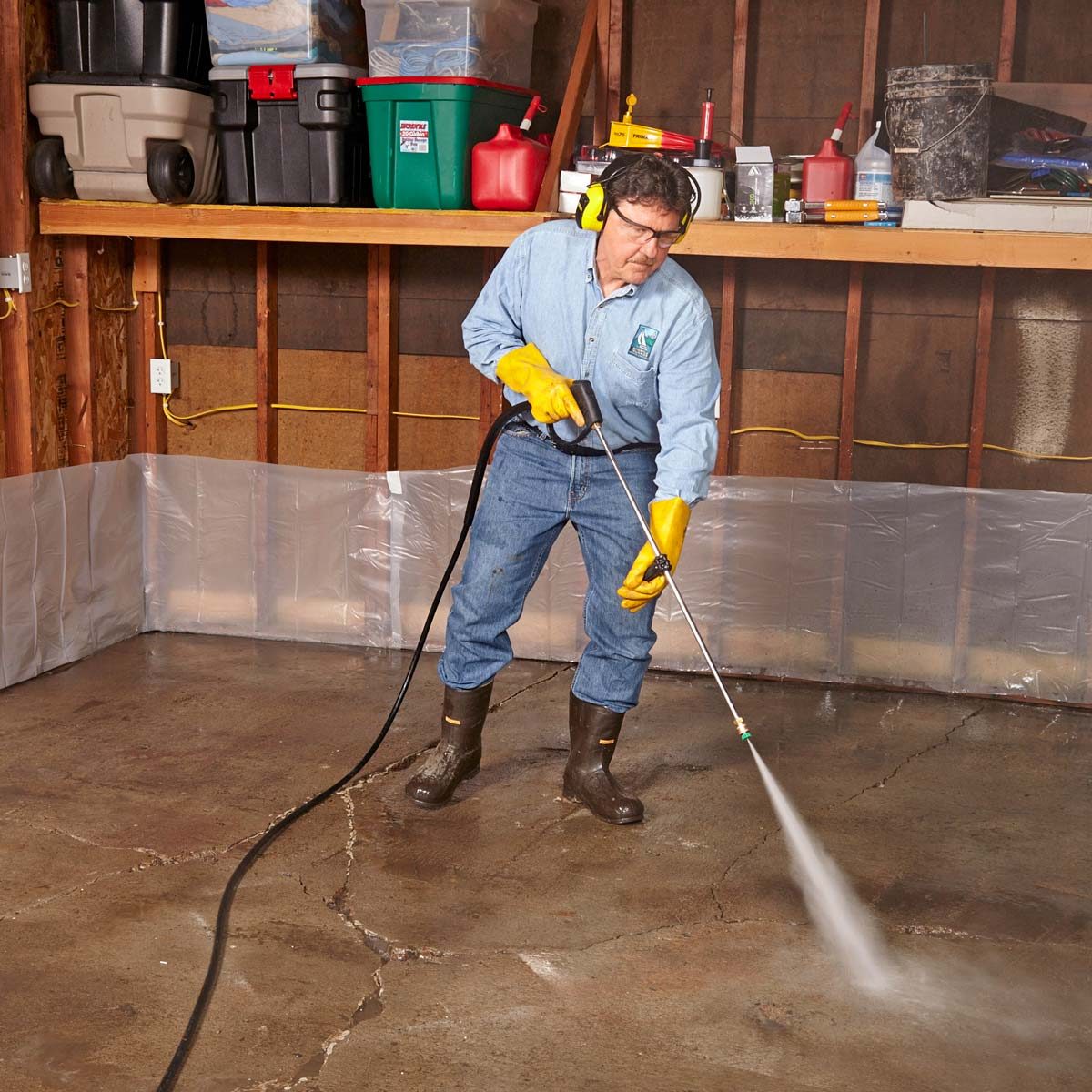- Protective gear: Rubber boots and gloves protect your skin against the degreaser and resurfacer (which can burn skin). You’ll also need eye and hearing protection. You’ll need a pressure washer, concrete cleaner (like Quikrete Concrete & Stucco Wash No. 8601-15), a brush, push broom and a floor squeegee. Buy enough concrete resurfacer material (such as Quikrete Concrete Resurfacer; 40-lb. bags) to coat the entire floor. Refer to the coverage specs on the bag to determine how many bags you need.