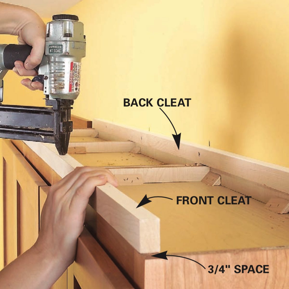 Nail cleats to the tops of the cabinets to elevate the shelf. Leave 3/4 in. of space on each side for the side cleats. The side cleats will overhang on the cabinet side. The cleats under the shelf are fillers to elevate the shelf just enough so the crown molding fits under the shelf and yet comfortably clears the doors below. We had about 1 in. of space above the doors, so we needed cleats that were 1-1/4 in. high.