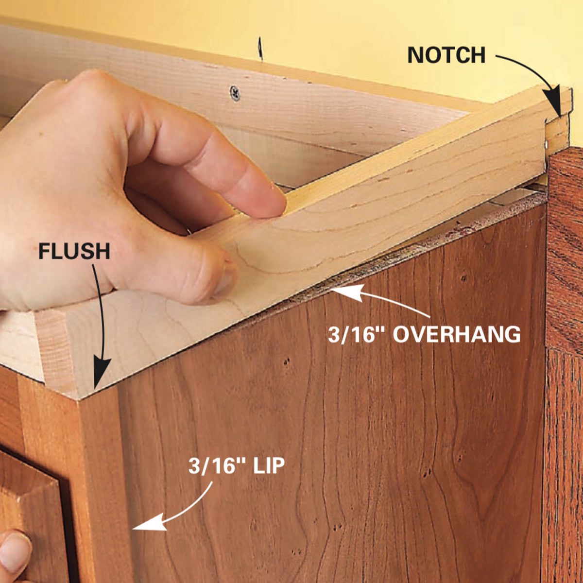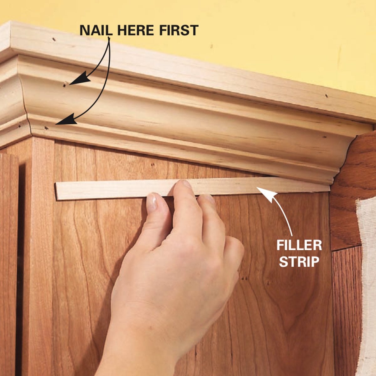 Fit the side pieces of crown molding and slip a 3/16-in.-thick filler strip under the front edge to hide the gap created by the face frame overhang.