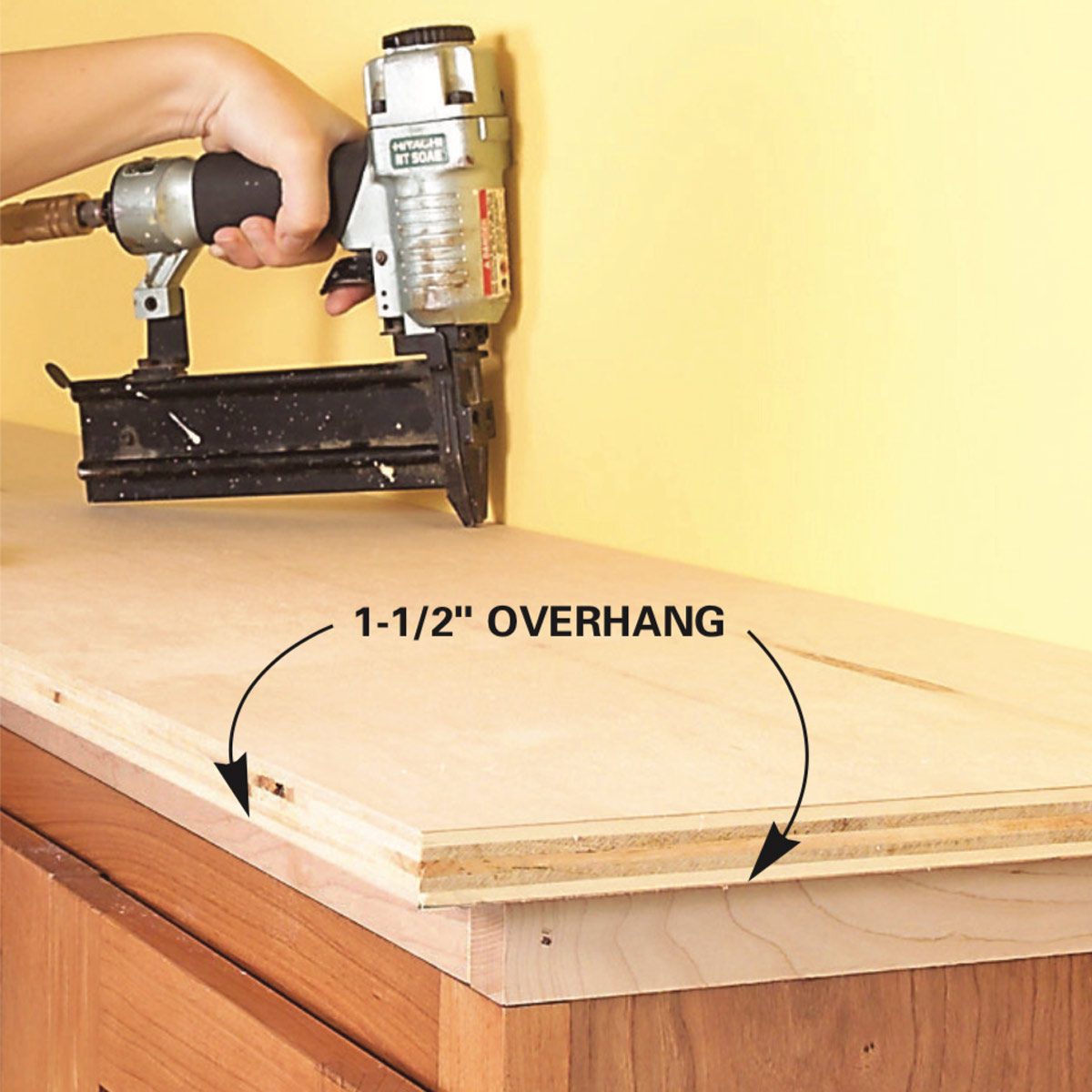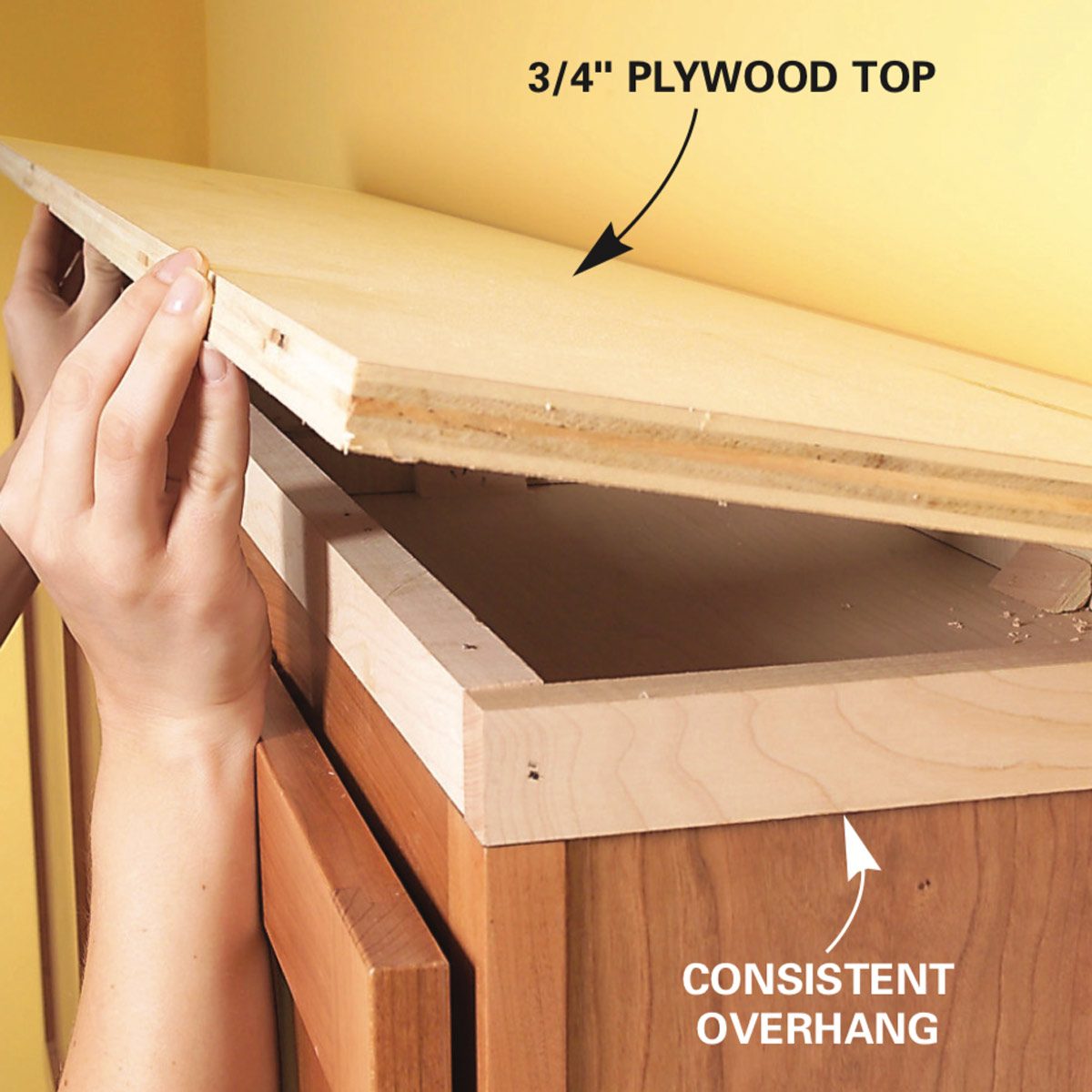 Measure and cut the top from 3/4-in. plywood, overhanging 1-1/2 in. on the front and each side. The best material for the main shelf is 3/4-in. plywood. Get a finished grade that is smooth and easy to sand.