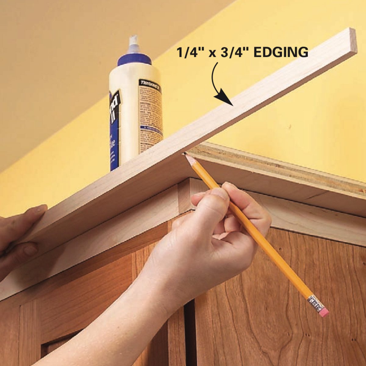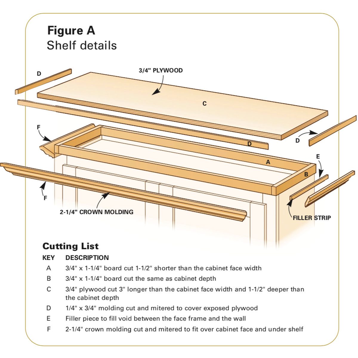 Measure the tops of your cabinets to determine your materials list. Also check the distance above the cabinet doors to determine the support cleat height for the shelf.