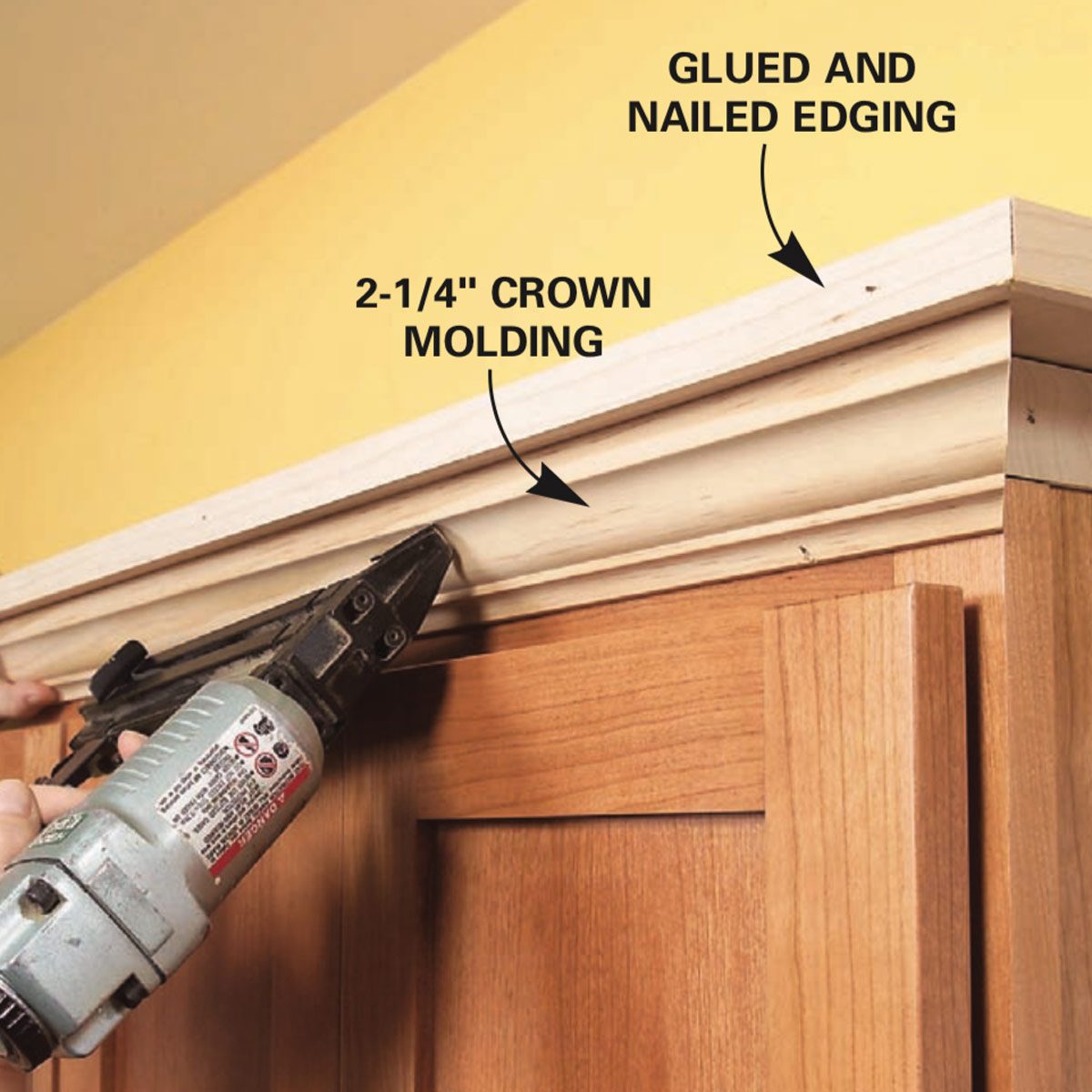 Glue and nail the 3/4-in.-wide edge molding to the exposed plywood edges. Miter the corners for a more finished appearance. If you don’t have access to a table saw, you can carefully cut them with your circular saw and an edge guide. Besides the 2-1/4-in. crown molding, you’ll need trim to cover the edge of the plywood for a finished look. You can use “screen” molding or “parting stop” or just rip a strip from a wider board to 1/4 in. or thicker. Just follow the photos for details about sizing and fitting the pieces.