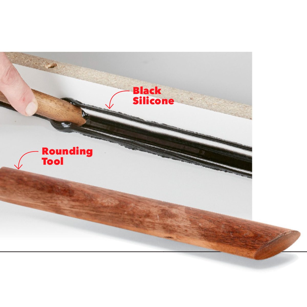 Run a healthy bead of silicone around the perimeter. Tool it into shape using a 3/4-in. dowel with the end cut at 45 degrees. While you’re tooling, let the excess spill over onto each side of the bead. After the silicone dries, those two lines can easily be pulled and scraped off. Black silicone works best because you can clearly see any excess that needs to be removed. Don’t use silicone on the inside edges. The silicone would make the form walls harder to remove, and those edges will be covered by the burner anyway.