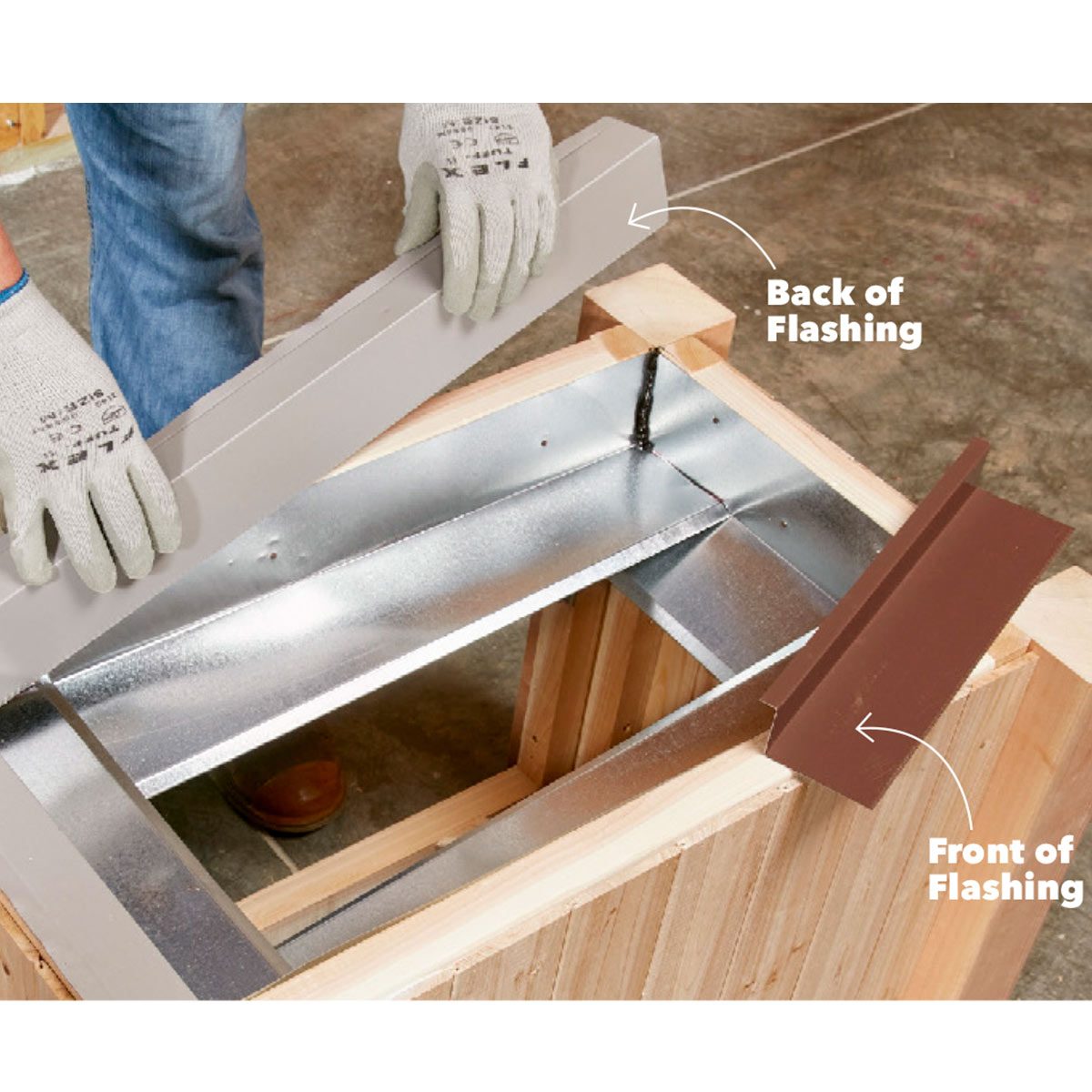 Cut the 3-1/2-in. x 5-in. x 10-ft. galvanized steel dormer flashing (available at home centers) to length with tin snips. Install the flashing, keeping the top flush with the top of the box. Secure the pieces with 1-1/4-in. exterior-grade trim nails or small screws. Seal the corners with RTV high-temperature silicone (sometimes called ‘gasket maker’).