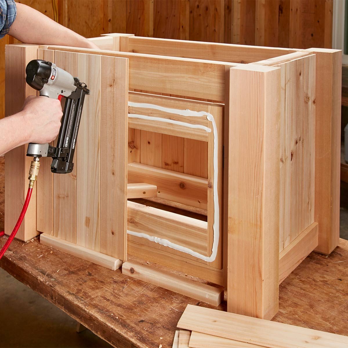 Cut the back and side tongue-and-groove planks (L) to length. On the back, rip 1 in. off the first plank; that way you’ll end up cutting about 1 in. off the last one as well. I started the first one by removing the groove side. Apply adhesive, and fasten the planks with 1-in. brads, two at the very top of each plank and two near the bottom. Dry-fit the last two planks on the sides before applying adhesive.