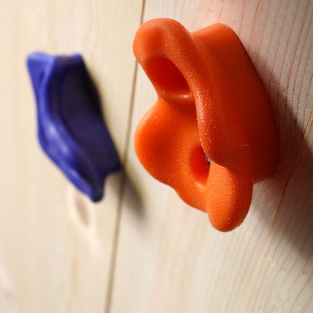 - Each hold should have two mounting holes. Install snugly with one bolt at first. Position the hold to your liking, and drill again through the remaining mounting hole to install the second bolt.