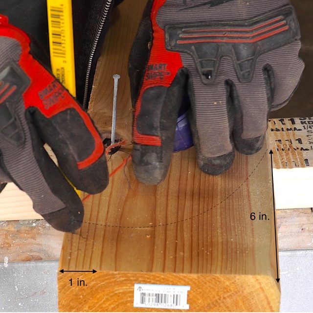 - Make a mark six inches from the opposite end of the 45-degree angle cut, 1 inch from the short edge of the leg.