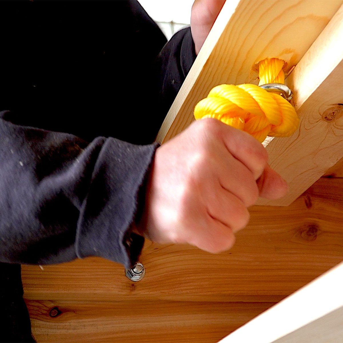 - Thread each 8 ft. length of rope through the face holes into screw eyes and tie off.