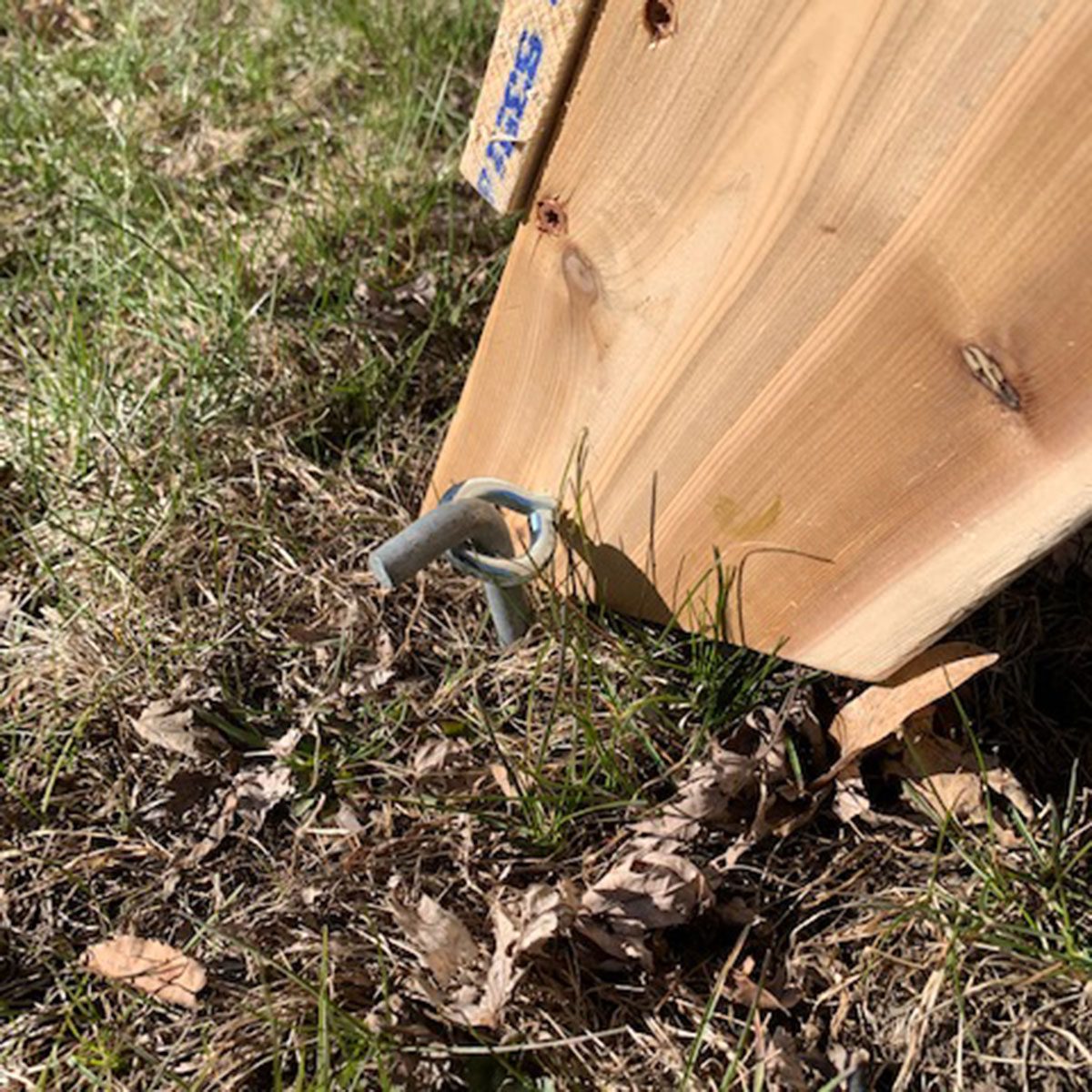 - Thread in the 5/16 x 1 x 1-1/2-in. screw eyes that will receive the 12-in. J-bolts for anchor stakes.