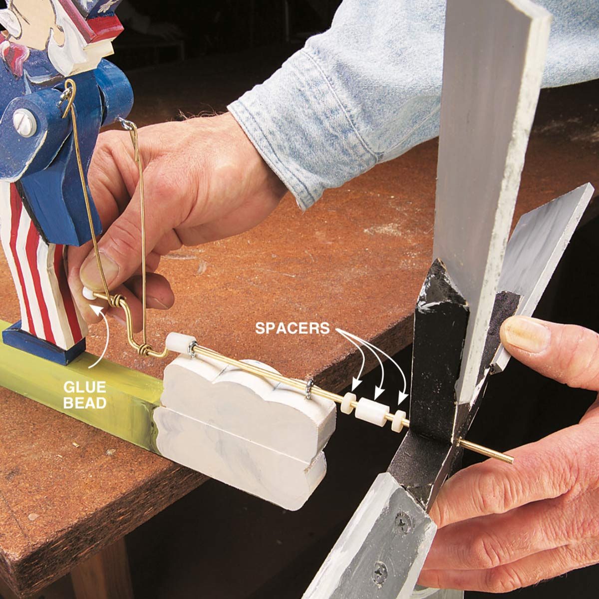 Drill holes through Uncle Sam’s arms, then use one arm hole as a guide for drilling the body. The holes for the binding post screw that holds the arms will be tight, so run the bit in and out a few times so the arms will move freely. Attach the arms to the body, using washers as spacers. Finger-tighten the binding post screw; the arms should move freely. Screw in screw eyes at the tops of the shoulders. Glue and screw the explosions and the flag to the platform.
