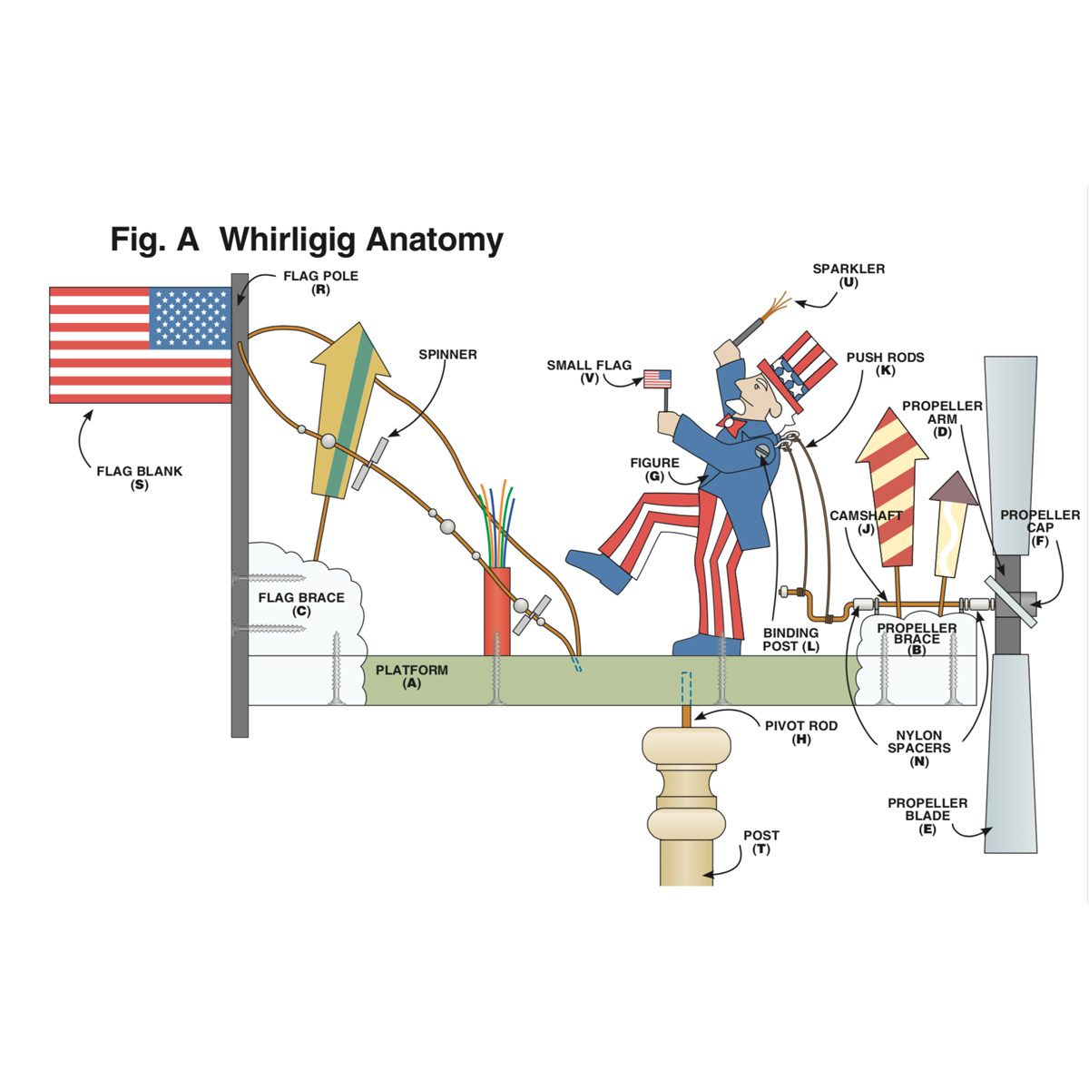 Folk art whirligigs fashioned from scraps of wood and metal have been popular for hundreds of years. In fact, George Washington bought some for his grandchildren during his trip back to Mt. Vernon after winning the Revolutionary War. You, too, can build this marching, spinning red-white-and-blue whirligig.