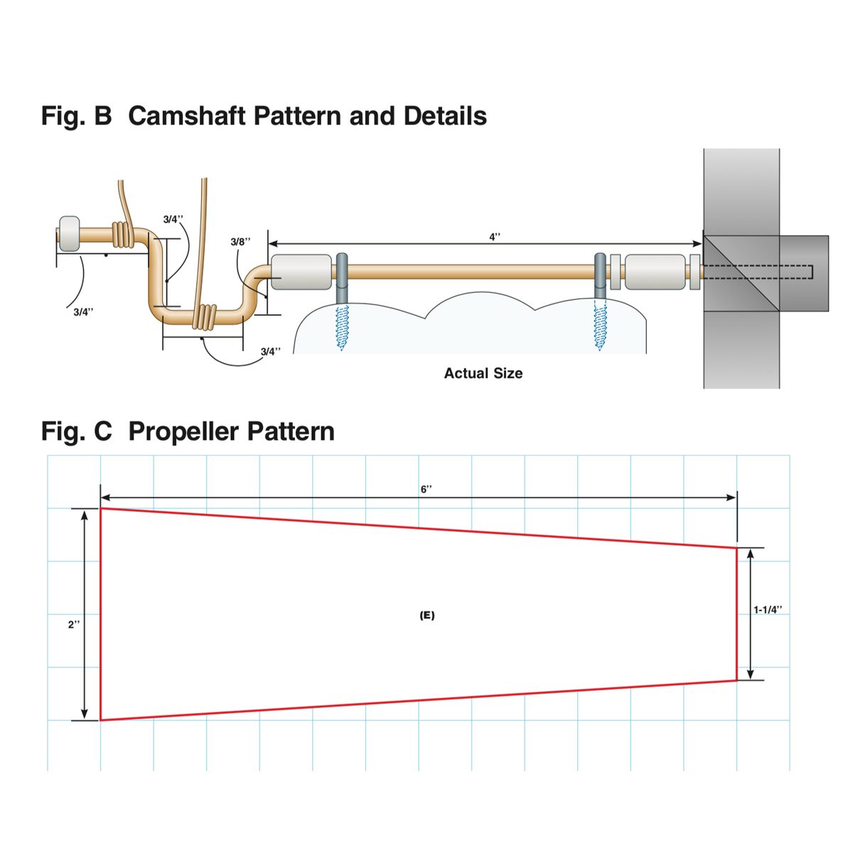 Bend the camshaft (using the pattern in Fig. B) by holding the brass rod tightly with a locking pliers about 1/8 inch back from where you want the bend, and then make the bends. Flatten any warps in the camshaft after all the bends are made.