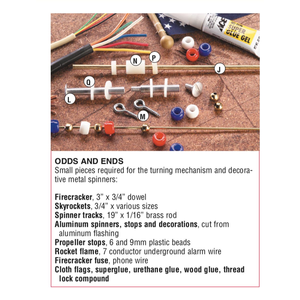 Drill holes in Uncle Sam’s hands and attach the flag and sparkler. Screw the firecracker to the platform and set the rockets on short lengths of 1/8-inch rod, with colored wire for the flames