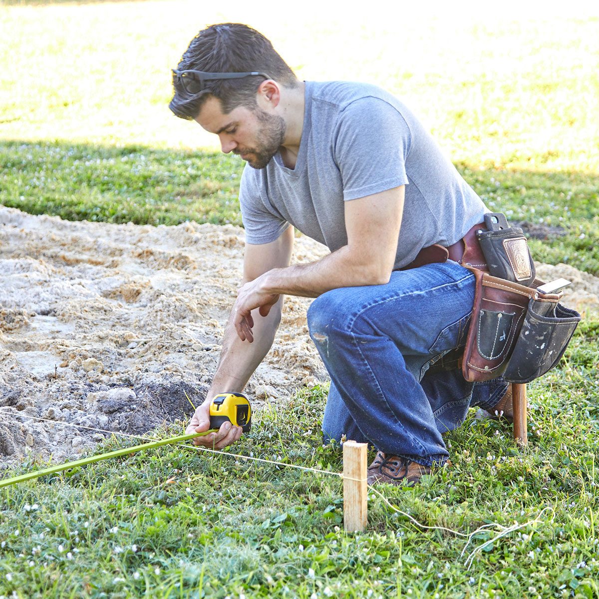 • Lay out the patio’s footprint with stakes and string. Make sure all the math works out and that the footprint is square.