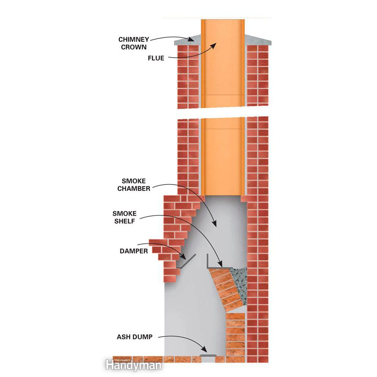 Clean creosote buildup from all parts of the chimney. Most chimney fires start in the smoke chamber/smoke shelf area, so it’s the most important area to clean (Figure A). Since that area is hard to reach in some fireplaces, check yours to see if you can reach into it and still have room to maneuver a brush. If you can’t reach it, this isn’t a DIY project.