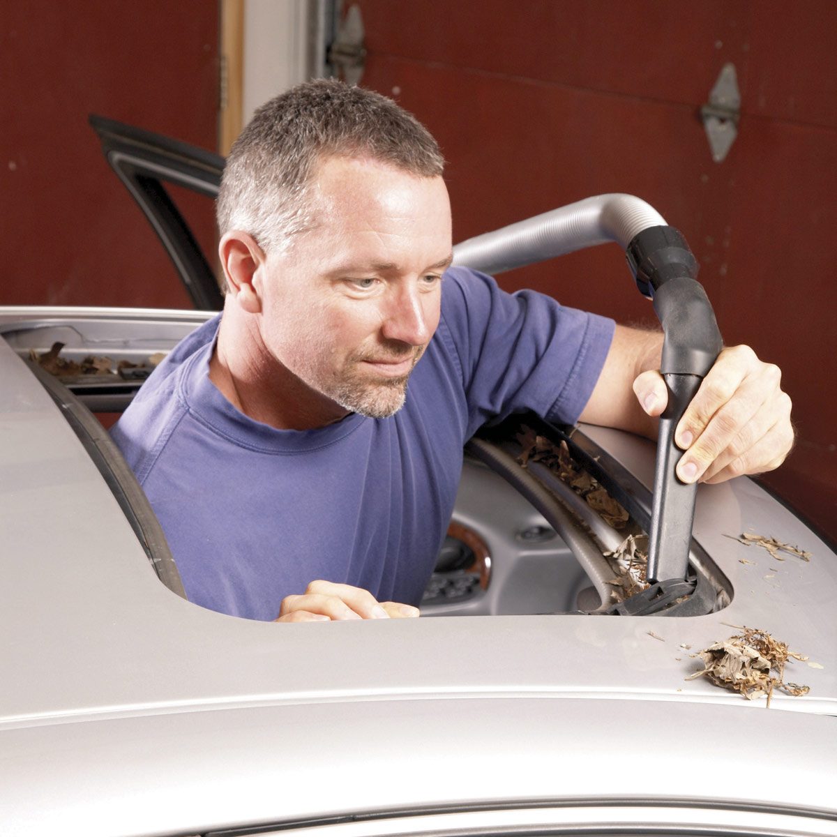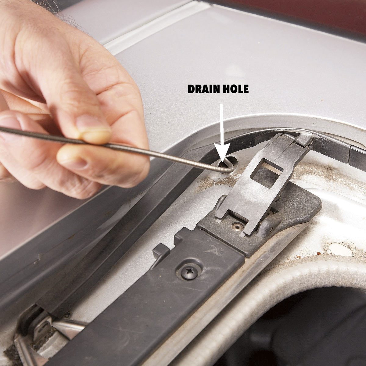 Open your sunroof and look for the drain holes in both front corners. Those tubes run through the door pillars and drain through to the rocker panels. You may be tempted to run a coat hanger down the tubes or blast them with compressed air. Don’t! You might poke the wire right through the tubing or disconnect it from the drain hole. Then you’d have to remove the entire headliner to reconnect it—a big job. Instead, use a shop vacuum and small-diameter vinyl tubing to suck out the clog.