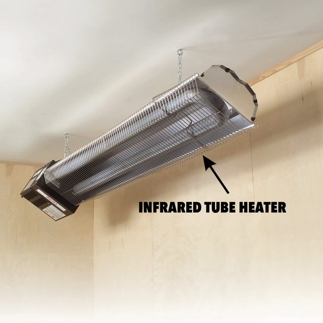 Installation is markedly different too. Infrared heaters must be installed a minimum of 7 ft. above the floor, and must hang down a minimum of 4 in. from the ceiling (check the manufacturer’s instructions, as these measurements vary with the size of the heater). It’s critical that you make sure objects below are not too close. The 30,000 Btu unit shown requires a minimum 3-ft.distance from heater to objects below. Most infrared heaters are installed at the back of a garage pointed toward the garage door, then aimed downward at a 45-degree angle. They can also be installed between car bays if the garage door opener rail allows and you don’t have a tall vehicle. Here are a few ways to heat your garage safely and reliably in winter.