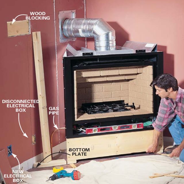 In addition, since electrical codes don’t allow you to simply cover a box that contains live wires, you’ll have to disconnect or relocate any boxes or receptacles that will be covered by the new fireplace.