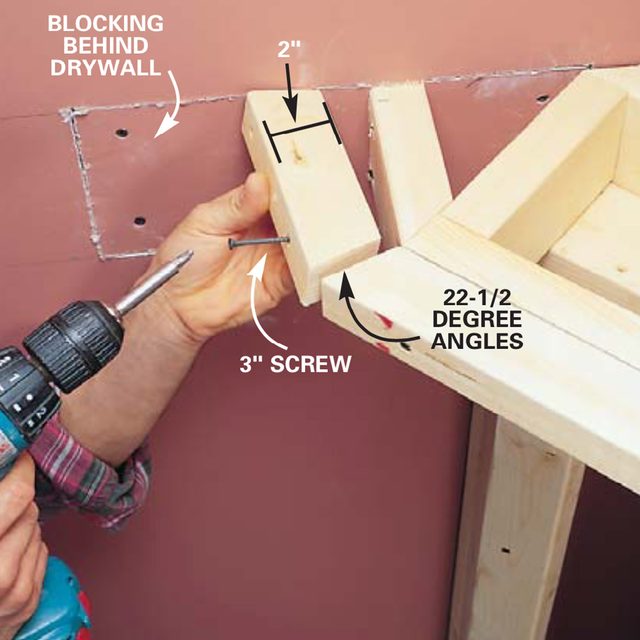- Miter short framing members to complete the angled ends of the mantel and attach them with screws.