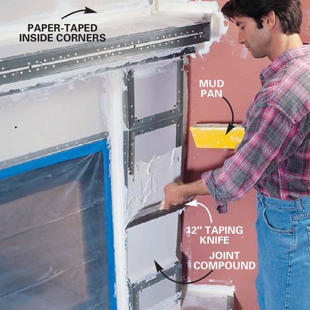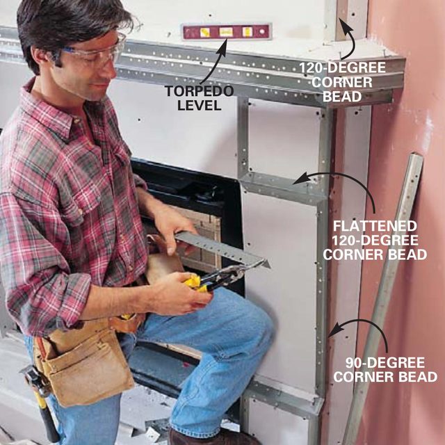 In addition to a basic set of hand tools, you’ll need a circular saw and a drill. A power miter box is handy but not necessary for cutting the angles on the framing parts. You’ll need a tin snips for cutting the metal corner bead, a collection of taping knives (2-in., 4-in., 6-in. and 12-in.) and a mud pan for applying the joint compound and texture.