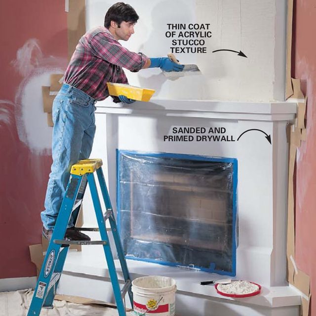 We decided to apply a sandy, plaster-like finish to the drywall on our fireplace. There are a dozen ways to accomplish this look. We chose an acrylic-based product manufactured by USG that’s typically used as an exterior finish. The USG Exterior Textured Finish is available in five textures, from fine to coarse, and 25 standard colors.