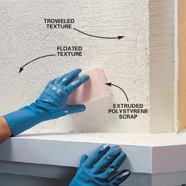 You’ll have to experiment a little to see what works. We used a square of extruded polystyrene foam insulation to float the texture, but a grout float, wooden block or hard plastic trowel also will work. Each tool gives a little different texture. Practice on a large scrap of drywall to get a feel for the material and refine your floating technique. Work from the top down to avoid splattering on completed texture.