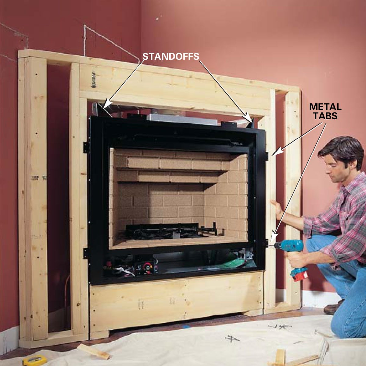 A direct-vent gas fireplace doesn’t need a chimney. Rather, you can run a special vent to the outside through an exterior wall. This process is simple and fire-safe as long as you follow the manufacturer’s directions. Be sure to read them carefully, because they might differ slightly from what we show here. For fire safety, however, make sure to heed the manufacturer’s directions on clearances for combustibles.