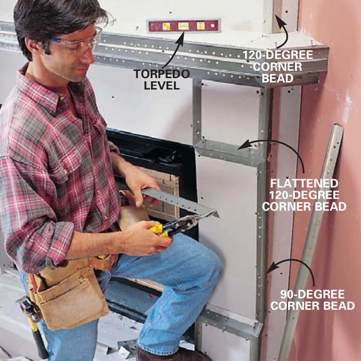 In addition to a basic set of hand tools, you’ll need a circular saw and a drill. A power miter box is handy but not necessary for cutting the angles on the framing parts. You’ll need a tin snips for cutting the metal corner bead, a collection of taping knives (2-in., 4-in., 6-in. and 12-in.) and a mud pan for applying the joint compound and texture.