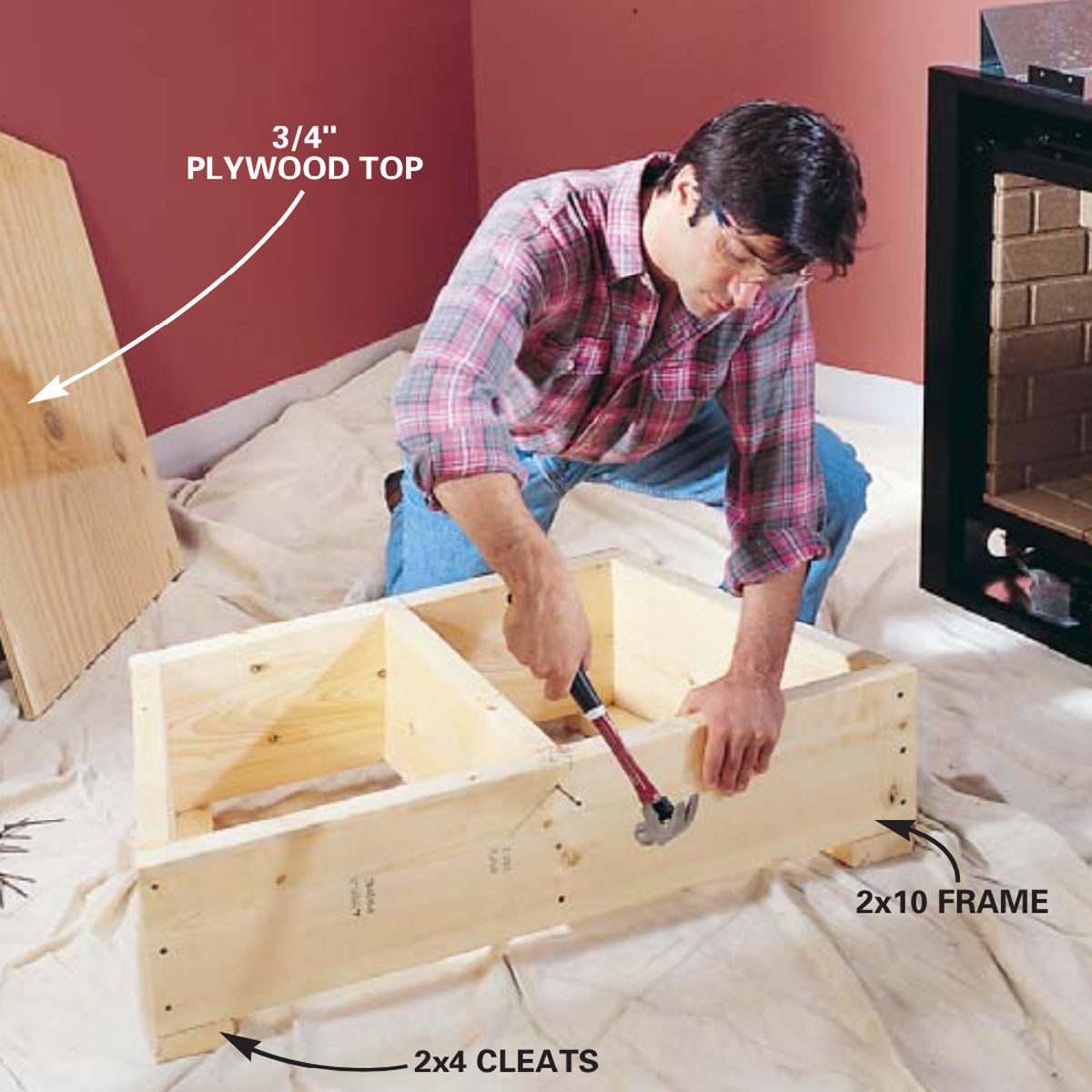- Construct the hearth of 2x10s covered with two layers of 3/4-in. plywood.