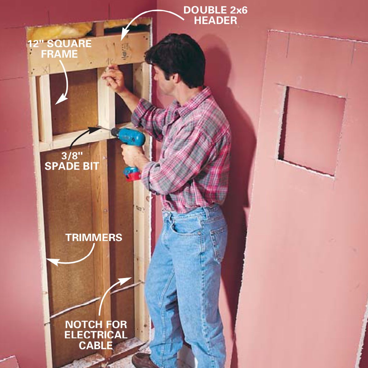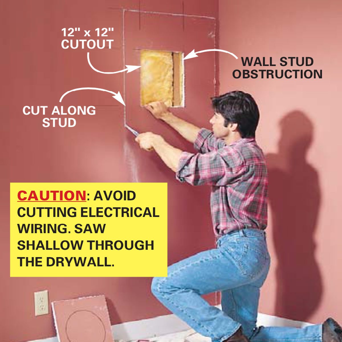 - Cut out the 12-in. square hole with a drywall saw and look for obstructions.