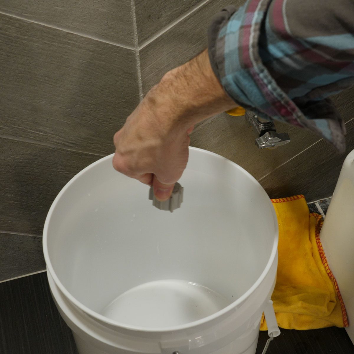 Before unhooking any of the hoses, flush the tank to remove most of the water. Place a bucket near the toilet shut-off valve and unscrew the supply hose from the toilet. Any leftover water in the tank will start to drip, so be sure to catch it with the bucket. Then remove the hose from the sink’s hot water supply valve.