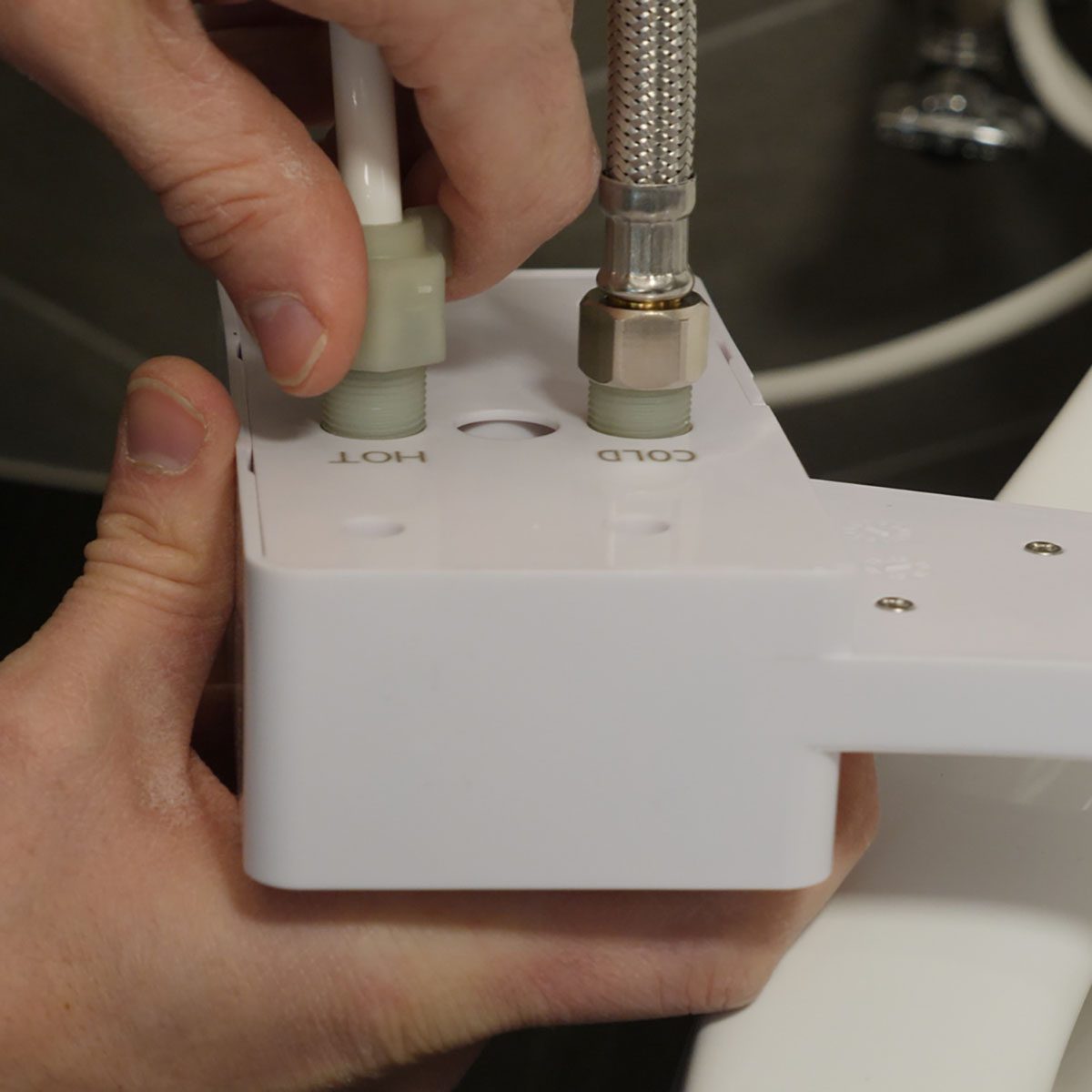 Unscrew the nut on the “hot” inlet and slide the white tube through the nut. Push the tube onto the stem and thread the nut over the tube onto the bidet inlet. Then connect the flexible hose to the cold supply inlet.