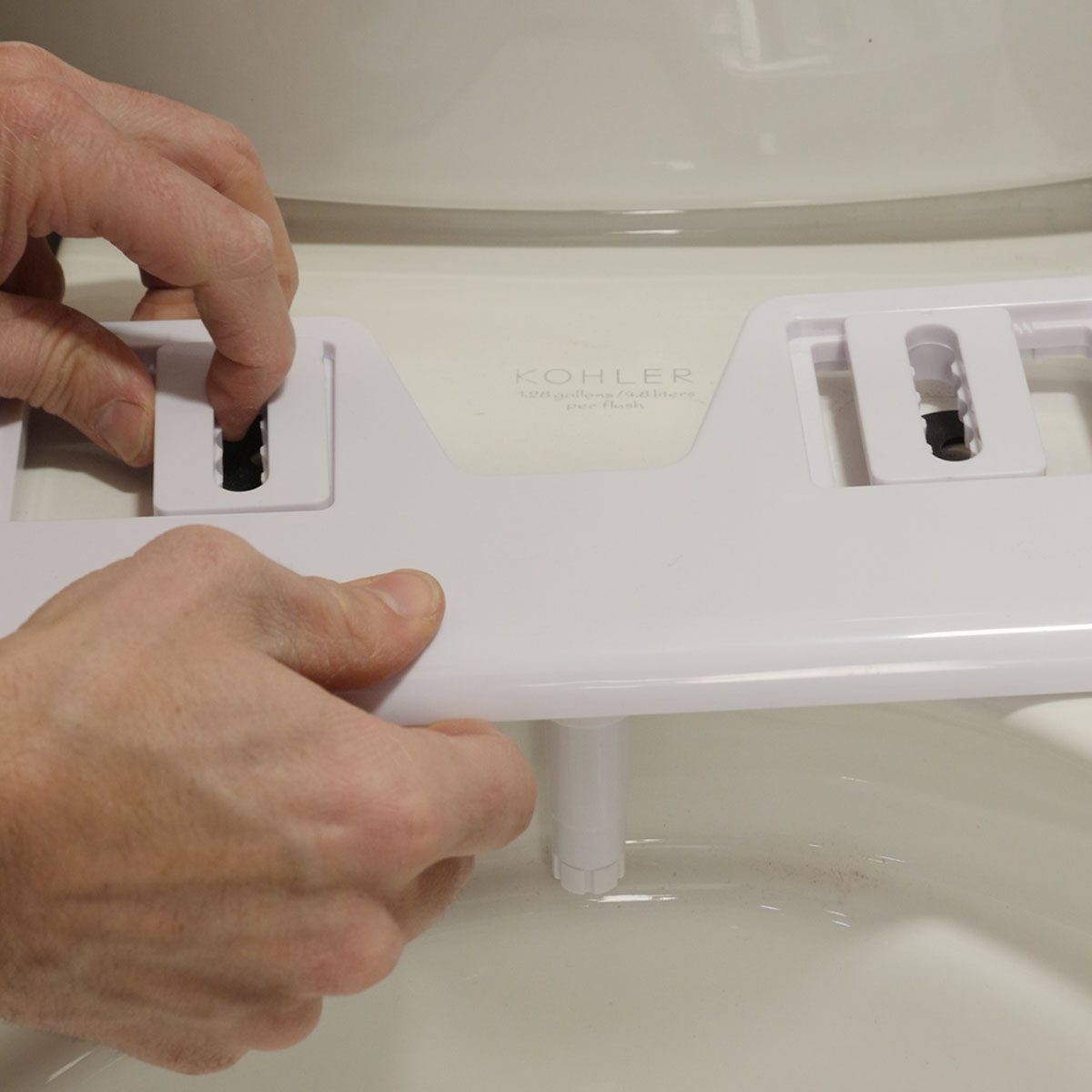Place the two rubber washers over the bolt holes and set the bidet attachment so that its spout is centered with the toilet bowl. Align its movable mounts with the bolt holes in the toilet, then re-attach the seat with the nylon bolts.