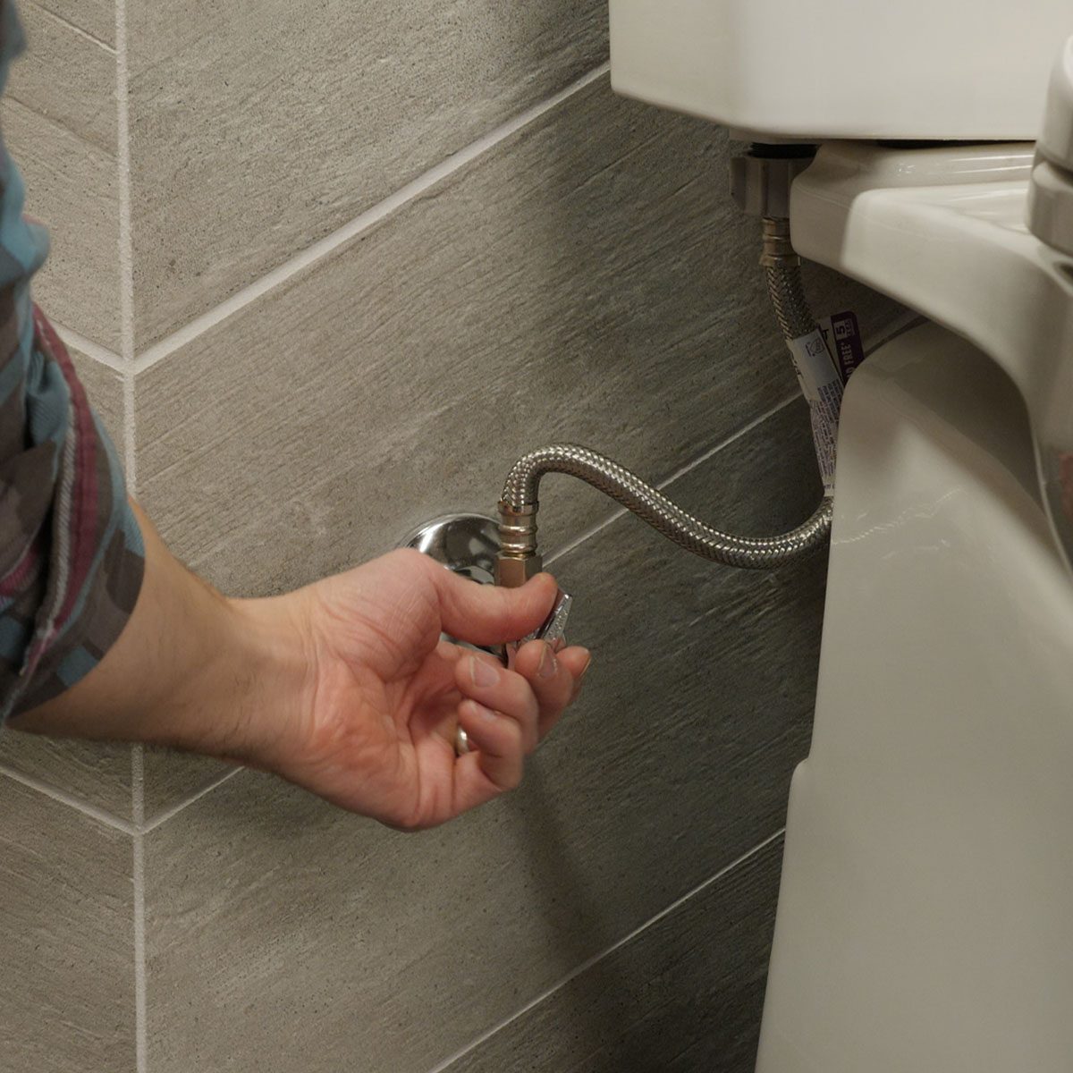 Place a rubber washer inside the adapter and screw it on to the hot water supply valve. Then screw the white tube onto the adapter. If you have a vanity cabinet, drill a hole through the side of it to snake the tube to the toilet. Cut the tube to length if needed.