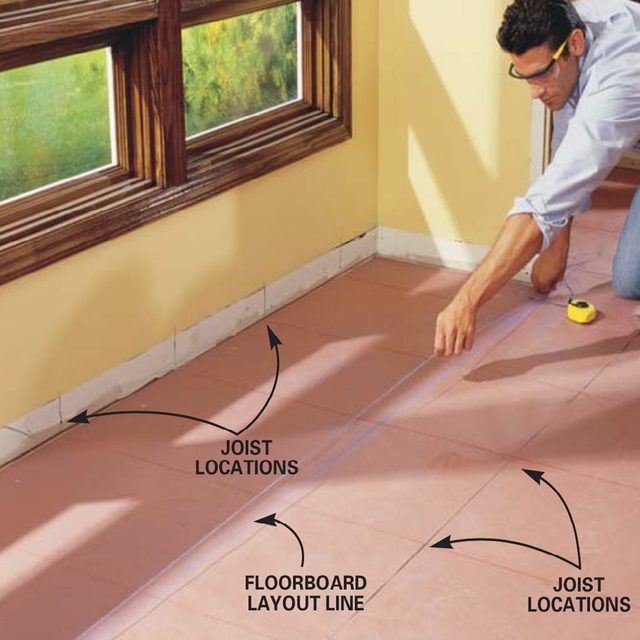 Carefully pry the baseboard and door trim from the wall and set it aside. Then remove the floor covering and underlayment (if you have any) to get to the subfloor. Underlayment is a layer of plywood or particleboard often found under carpet or vinyl. Now is the time to do repair work on the subfloor. Remove the existing floor covering and pry up the underlayment with a pry bar, leaving the subfloor intact. Pull all protruding nails. Walk the floor to check for loose or squeaky spots in the subfloor. To tighten the subfloor, drive 2-in. screws into the joists.