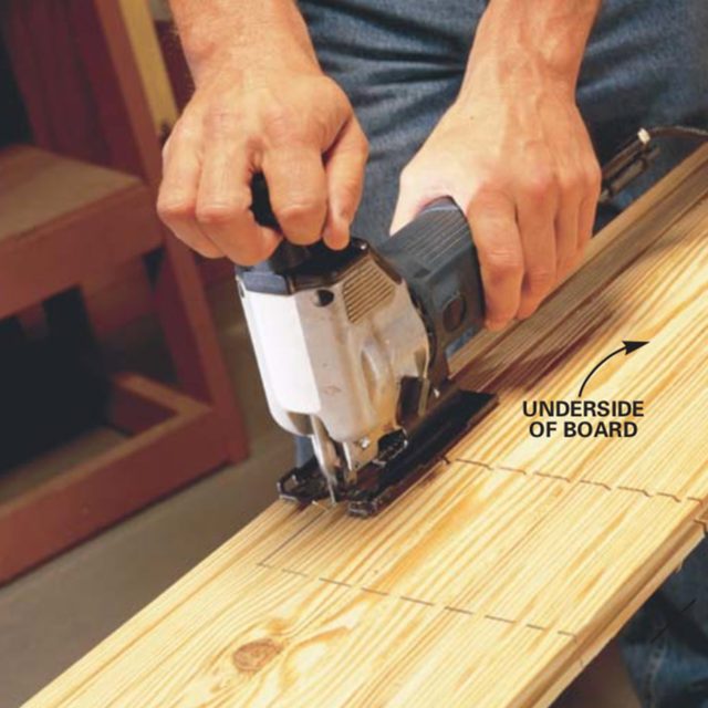 Cut boards to length with a circular saw. Clamp on a guide to ensure square cuts and cut from the back side of the board (to minimize splintering the good side). If you use a sliding miter saw, cut with the good side up.