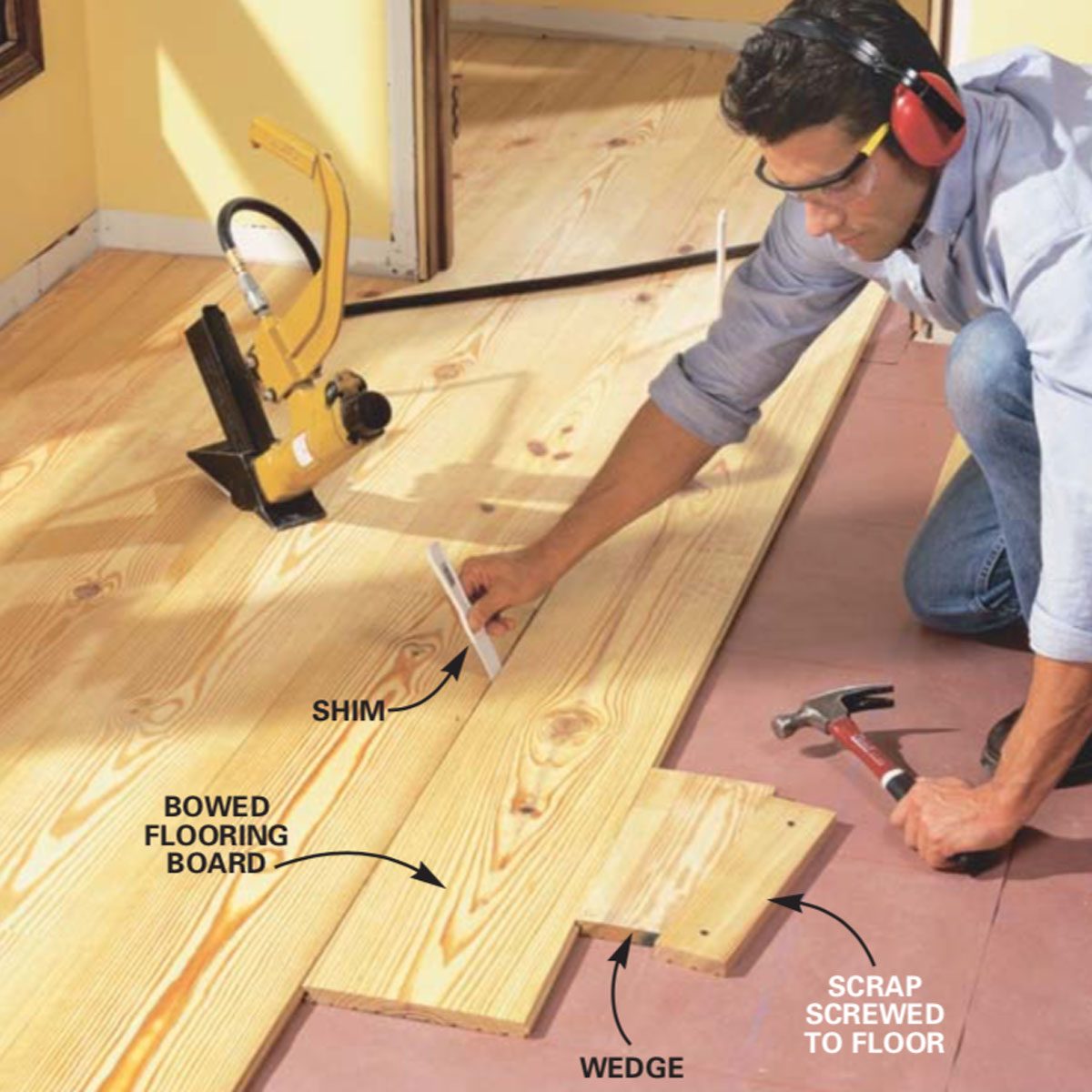 Installing tongue and groove flooring: Wedge bowed boards straight